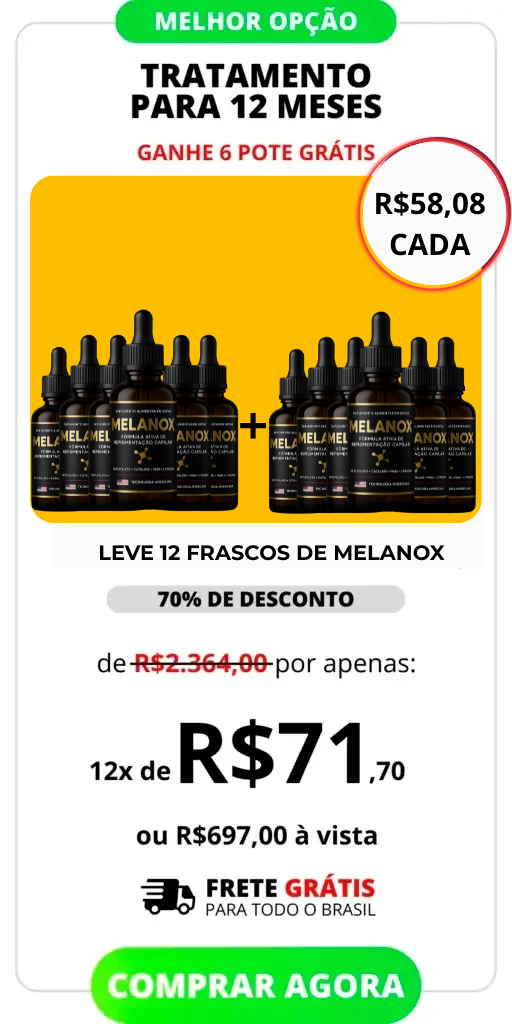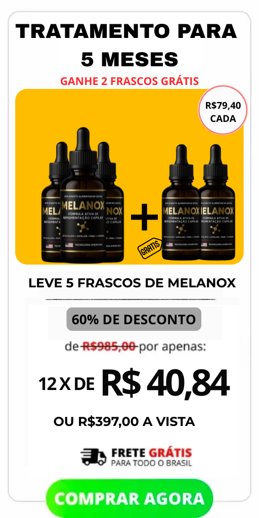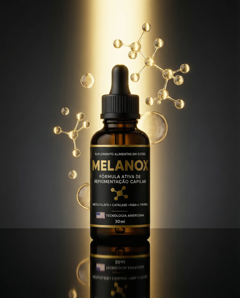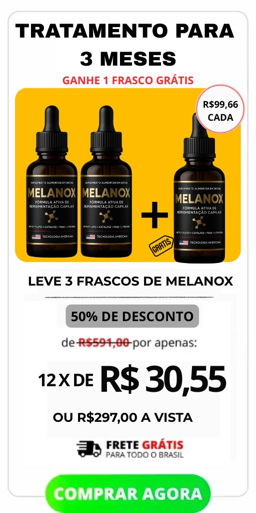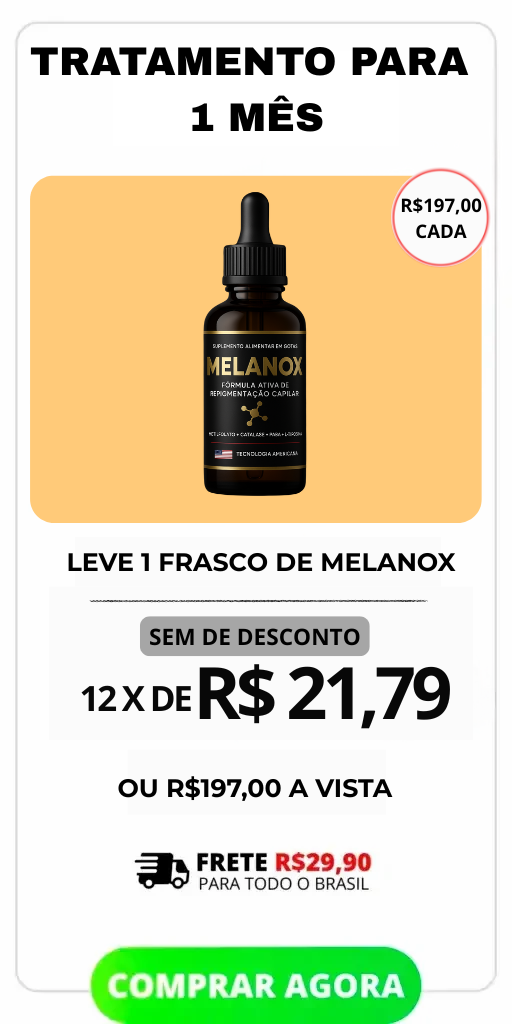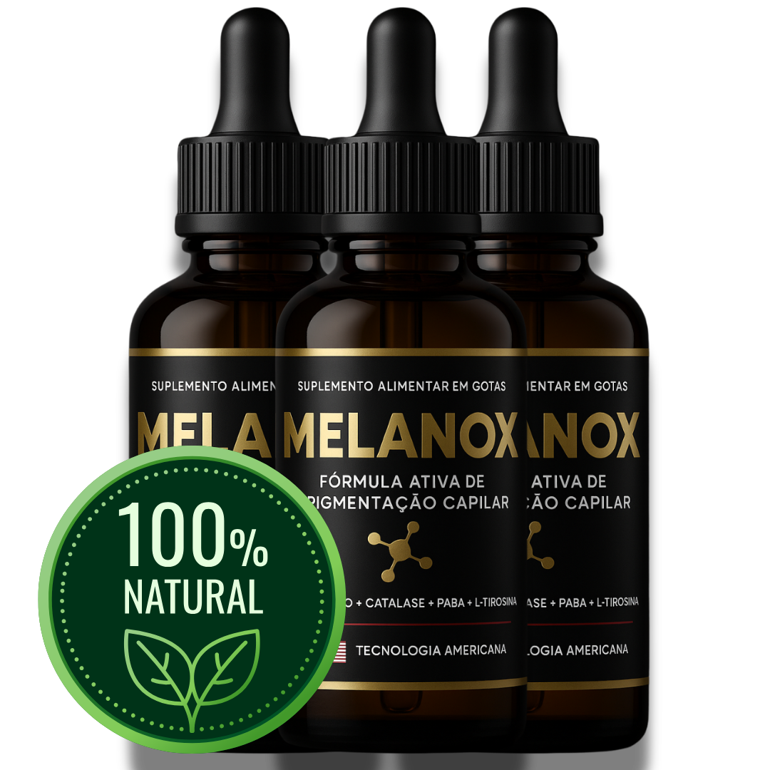 "O Melanox é um produto 100% natural criado para reconstruir as fibras capilares. Um tratamento que age direto na causa dos cabelos brancos, trazendo resultado imediato sem os problemas que uma medicação forte pode causar no seu fígado e estômago, um tratamento de dentro para fora. Além disso, o Melanox tem um sabor agradável de laranja e você pode diluir 12 gotas em água ou na sua bebida preferida."